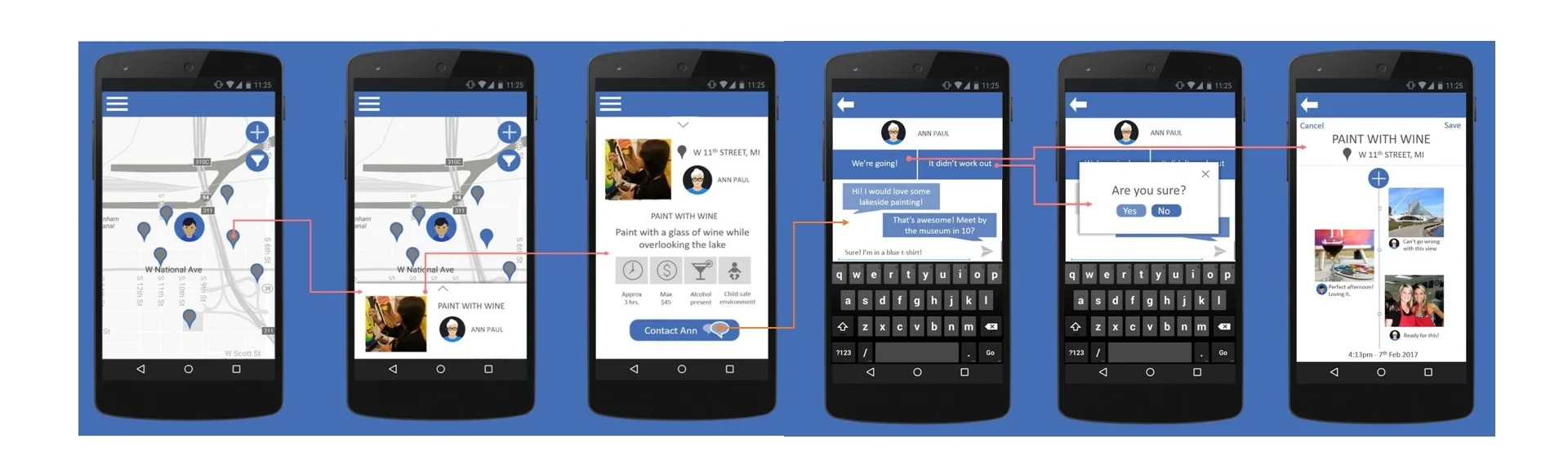 Screenshots of our final design: Our concept was for travelers to be able to discover and join activities hosted by locals, in real time. During the activity, both the host and the traveler can contribute snapshots to a shared experience timeline. This experience can then be archived as a memory to be relived and shared down the line in the future.